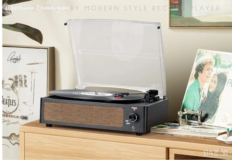 Винилов грамофон с високоговорители, задвижван с ремък, 3 скорости, безжично възпроизвеждане