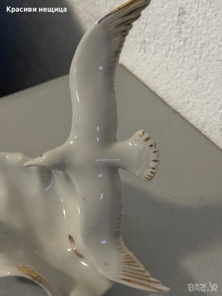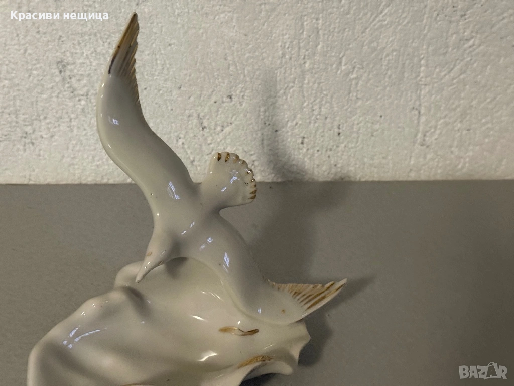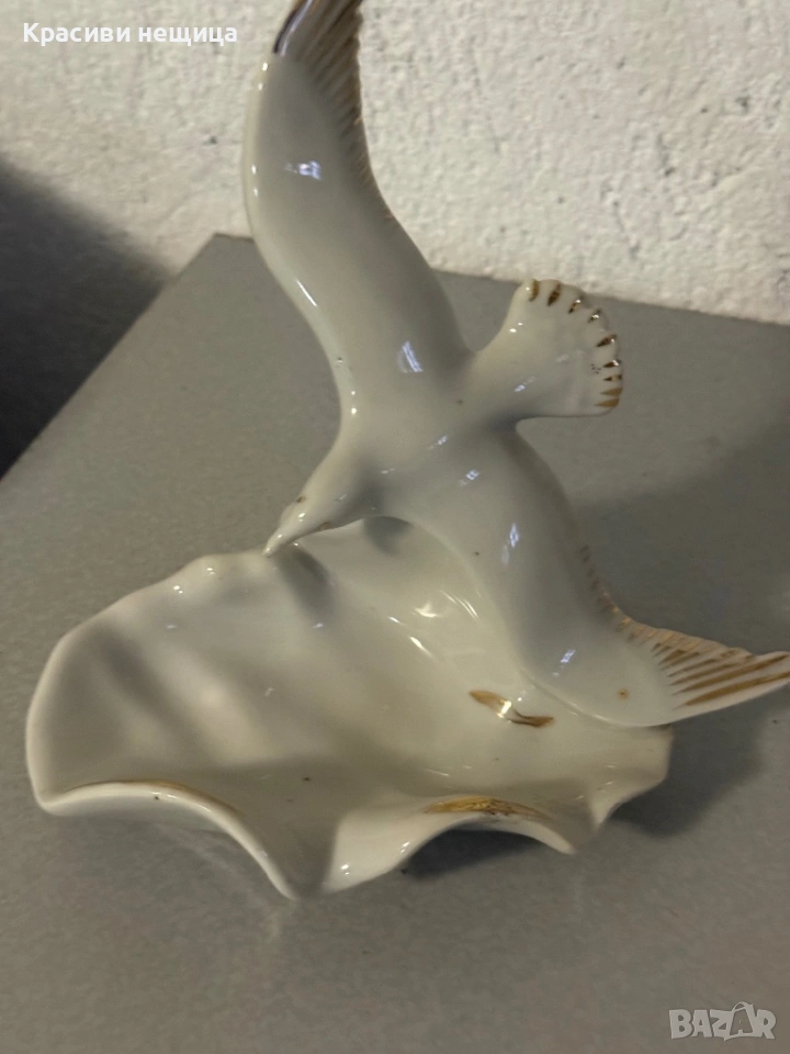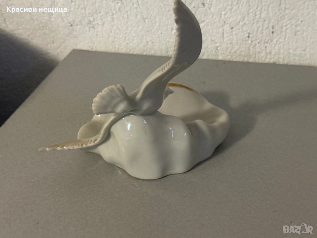 Винтидж порцеланова чинийка или пепелник с изображение на птица - гълъб или чайка, със златни акценти.