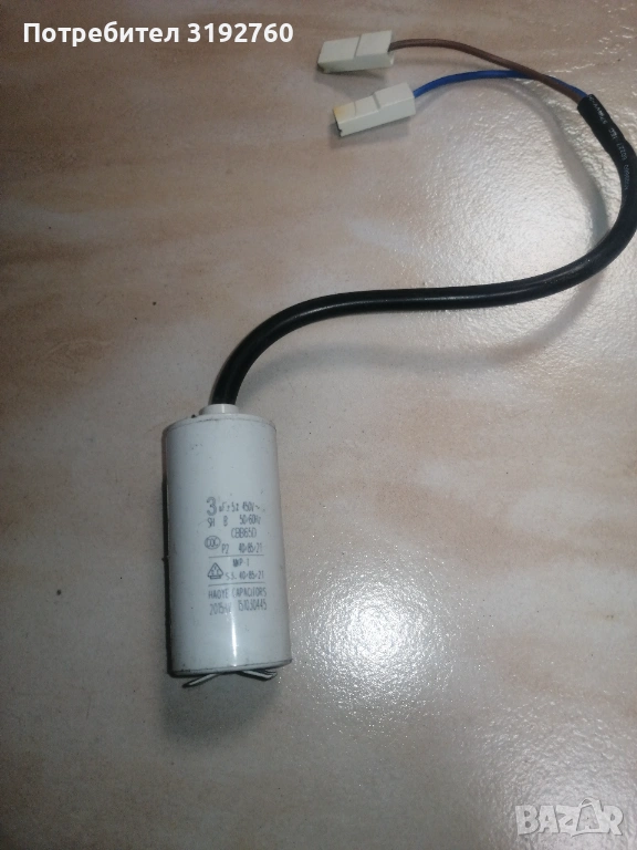 кондензатор за електрически двигатели. Характеристики Кондензаторът има следните основни характеристики, видими на етикета му: Капацитет: \(\mathbf{3\mu F}\) (микрофарада).Напрежение: \(\mathbf{450V~AC}\) (променлив ток).Толеранс: \(\mathbf{\pm 5\%}\).Честота: \(\mathbf{50/60~Hz}\).Тип: Обикновено се класифицира като CBB60 или подобен модел. Приложение Тези кондензатори се използват широко в различни домакински и промишлени уреди, които разполагат с еднофазни променливотокови двигатели, за да осигурят необходимия пусков ток и да поддържат работата на двигателя: Перални машиниСушилни машиниКлиматициВодни помпиВентилаториХладилници и фризери