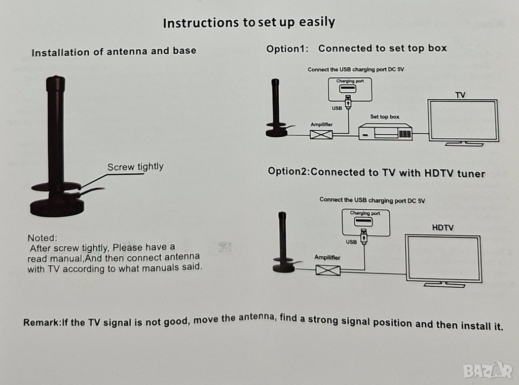 За оптимален резултат завинтете здраво антената към основата. При слаб сигнал преместете антената на позиция с по-добро приемане.