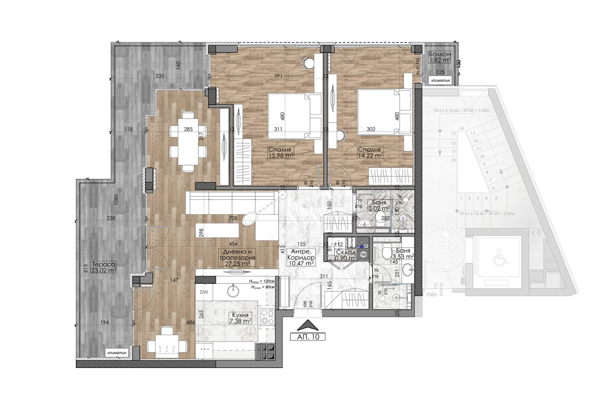 Представеният апартамент 10 се намира на 5-ти етаж и е със застроена площ от 118,98 кв.м. и обща площ от 135,11 кв.м.