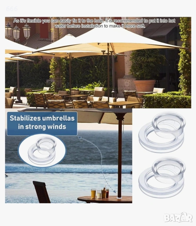 Лесен за използване: монтирането на пръстена за чадър не изисква много усилия; Тъй като е гъвкав, можете лесно да го фиксирате в дупката, препоръчително е да го поставите в гореща вода преди монтаж, за да стане по-мек.
