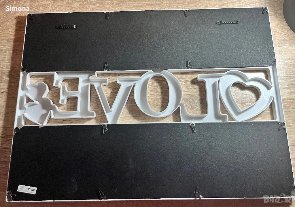 Рамка за колаж с 6 снимки с надпис "LOVE". Подходяща за поставяне на семейни или любими снимки. С опция за закачване на стена. Има леки забележки - липсват два от държачите в долния ляв и десен ъгъл, но без тях също е напълно функционална рамката