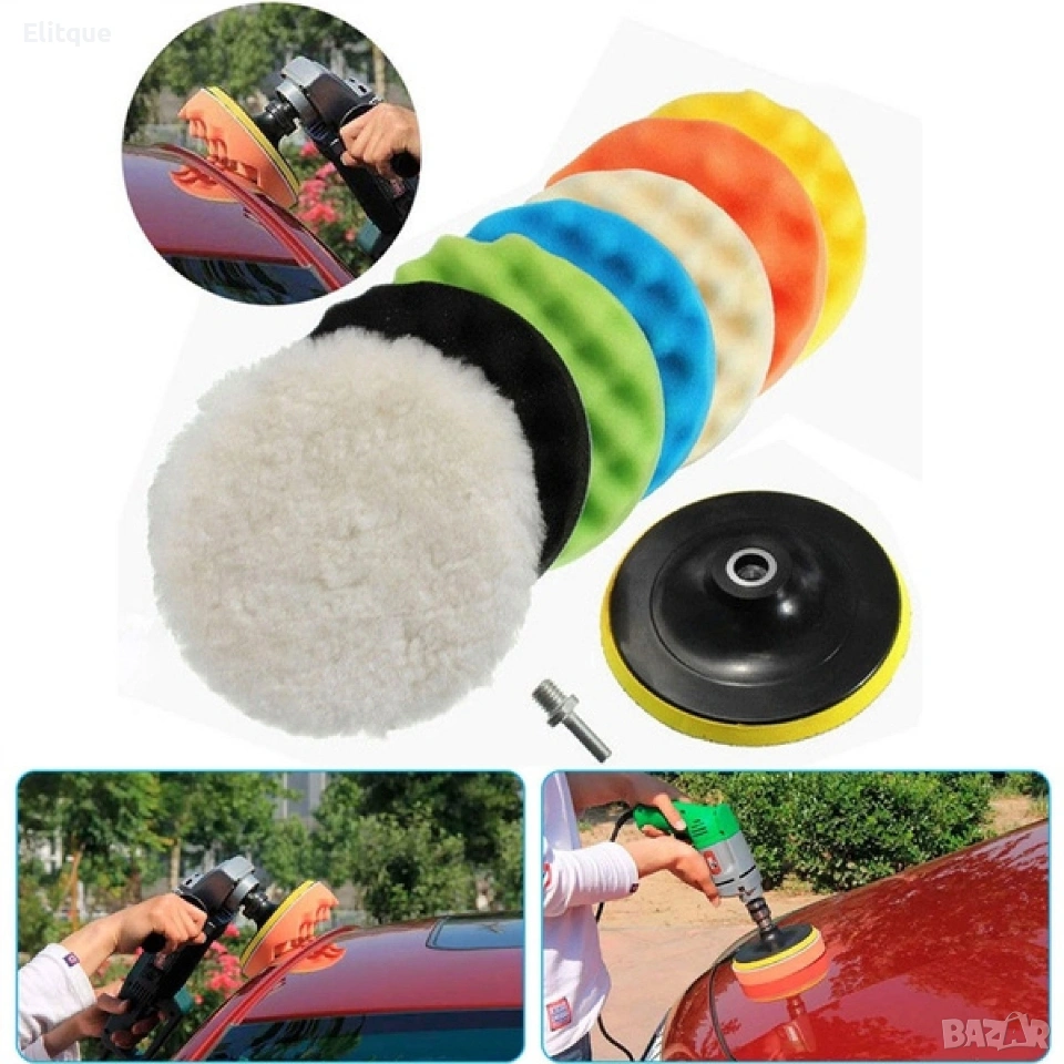 Комплект от 8 части за полиране със сменящи се подложки. Редовното полиране на вашия автомобил създава защитна бариера на боята срещу атмосферните условия. Могат да се използват за восъчна, полираща или запечатваща паста за всички видове лакови бои. Също така са подходящи за полиране на автомобилни детайли. Накрайниците за полиране могат да се използват с пневматична или елекрическа полираща машина. Комплекта съдържа: 5бр. полиращи подложки; 1бр. вълнена подложка; 1бр. подложка; 1бр. адаптер.