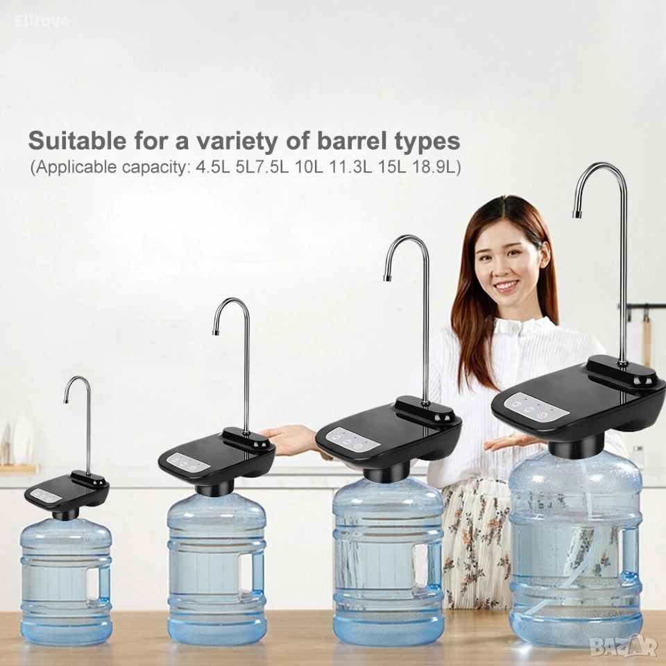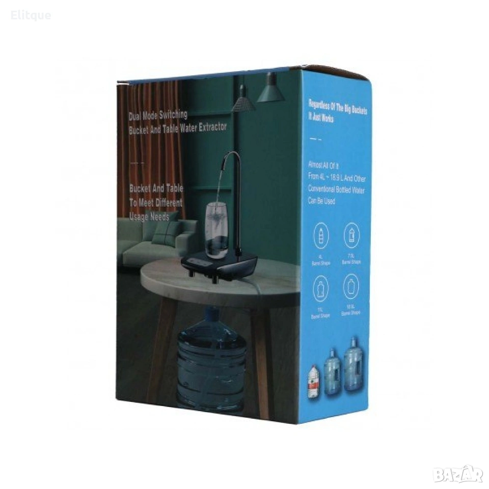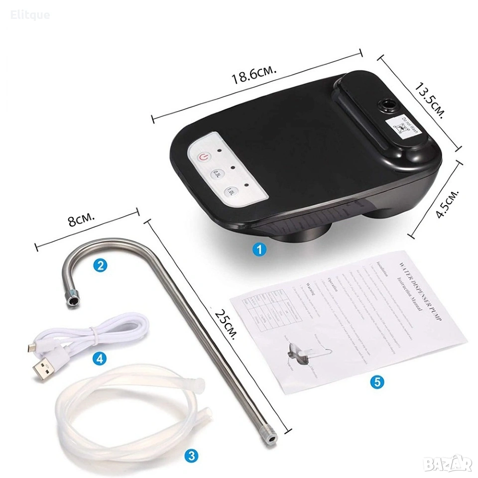 помпа подходяща за използване на открито или закрито, за всеки дом или офис. Лесна за пренасяне, с изчистен дизайн. Помпата притежава въртящ се на 360 градуса водопроводен чучур. Притежава 2 режима на интелигентен количествен изход (0.3L и 1.0L) на вода, както и бързо извеждане на водата с един бутон. Подходяща е за бутилки от 4 до 19L. Характеристики: Материал: ABS пластмаса; Мощност: 4W/3.7V; Литиева батерия: 1200mAh; Избор на капацитет (количествена мощност на водата) : 2 режима – 0.3L. и 1.0L.; Подходящ за 4.5, 5, 7.5, 10, 11, 15, 19 литрови туби и галони; 360° ротация на чучура - според удобствово Ви; Чучура през, който минава водата е от специална неръждаема стомана; Зарежда се с включен USB кабел - без досадна смяна на батерии; Дизайн с удобна правоъгълна поставка за чаши. Комплектът включва: 1 х електрическа водна помпа; 1 х чучур; 1 х силиконов маркуч; 1 х USB кабел; 1 х ръководство на потребителя.