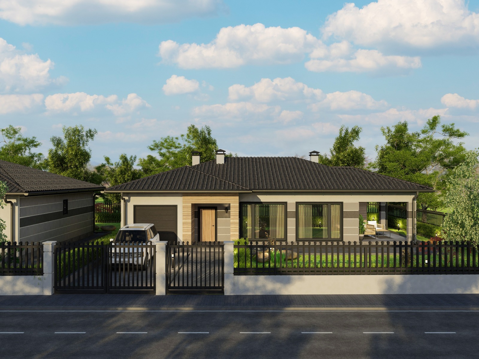 Конструкцията на къщите е със стоманобетонни основи, метална носеща конструкция и дървена конструкция за покрива. Фасадните стени ще са изградени по метода после слоен монтаж система W361, аквапанел външно монтиран на щендерна конструкция, каменна вата 10см, един слой гипсокартон, отново камена вата 10 см, два слоя гипсокартон монтиран на щендерна конструкция от вътре, система W112. Върху аквапанела XPS 2 см оформящ визията на фасадата, минерална мацилка, в определени зони с дървесен ефект, цокъл с естествен камък. Вътрешни преградни стени, система W112 гипсокартон монтиран на щендерна конструкция и пълнеж вата за шумо и топлоизолация. ВиК инсталация до тапа. Отоплителна инсталация до тапа, с изградени серпентини за водно подово отопление.