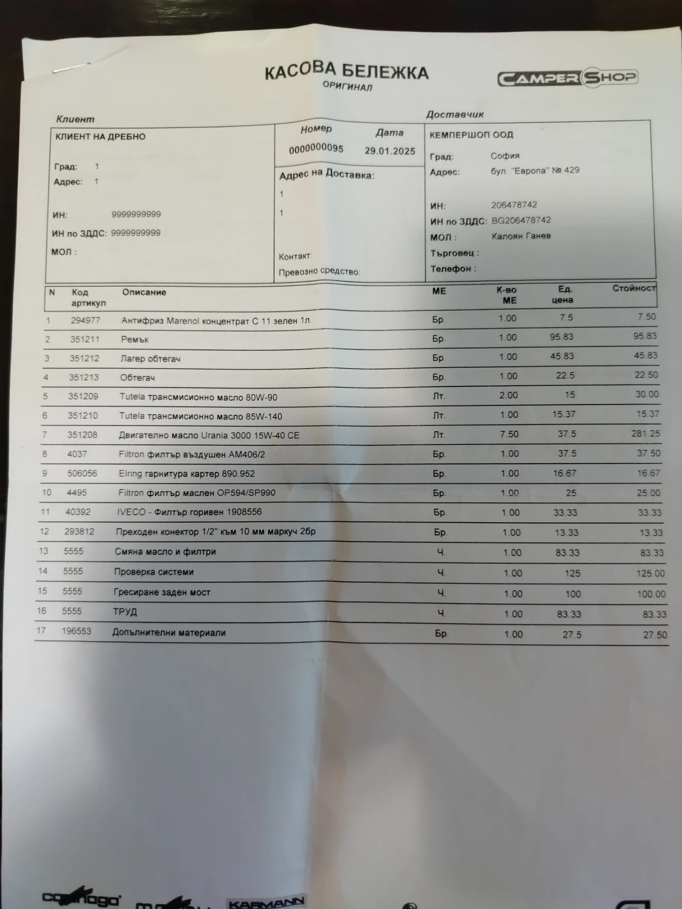 MOBILVETTA IVECO DAILY 2. 8. TD 35 12 122 к. с. Кемпера съм го закупил от Нидерландия на 149. 700 км. на 02. 11. 2024г. От първи собственик и е докаран до България на собствен ход. Изминати 2200км. без никакви проблеми. В момента е на 153. 800 км. като за изминалата година съм ходила два пъти до Гърция и един път до язовир Батак . За жалост либса на свободно време е причината за раздялата с него. Обслужен е пролетта в сервиз КЕМПЕРШОП ООД. Масла, ремъци всичко нужно и цялостен преглед. Октомври му направих външно освежаване на боята. Кемпера е закупен 1999 г. но е пуснат в експлоатация през 2008г. за всичко има документи и фактури. В кемпер всичко работи като на 12 /220 волта така и на газ безупречно. Уникално разположение и много широко. Има форселт, които мисля че е нов не съм го слагал. Много важно нещо с двойна гума до 3500 кг . и се кара с категория Б, има въздушни възглавници, навигация, камера за заден ход, Ел. Огледала и Стакла . Два бр. Соларни панела. Разхода на гориво е между 9/10 л. на сто при скорост 90/110 км. Ч. Уникален разход. Два бр. комплект ключове и всички документи и фактура до момента от самото начало. Голяма згаваема маса и 3 бр. удобни сгаваеми столове на три дневен изглед на язовир Батак, закупени от Декатлон. За повече информация по телефона.