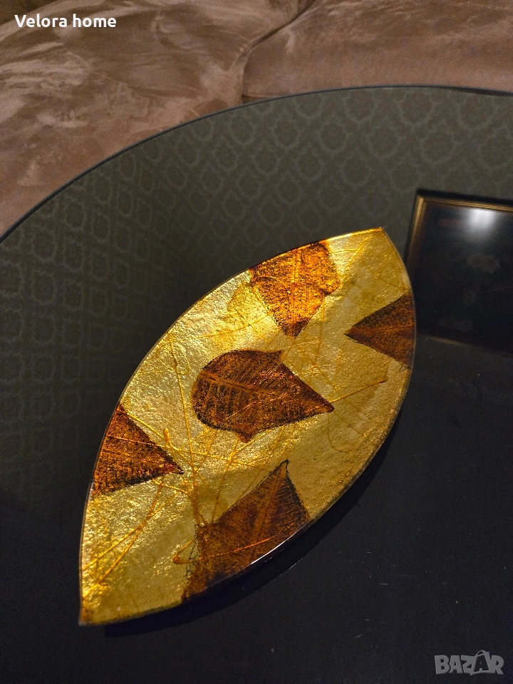 РЪЧНА ИЗРАБОТКА, стъклена чиния във формата на листо.