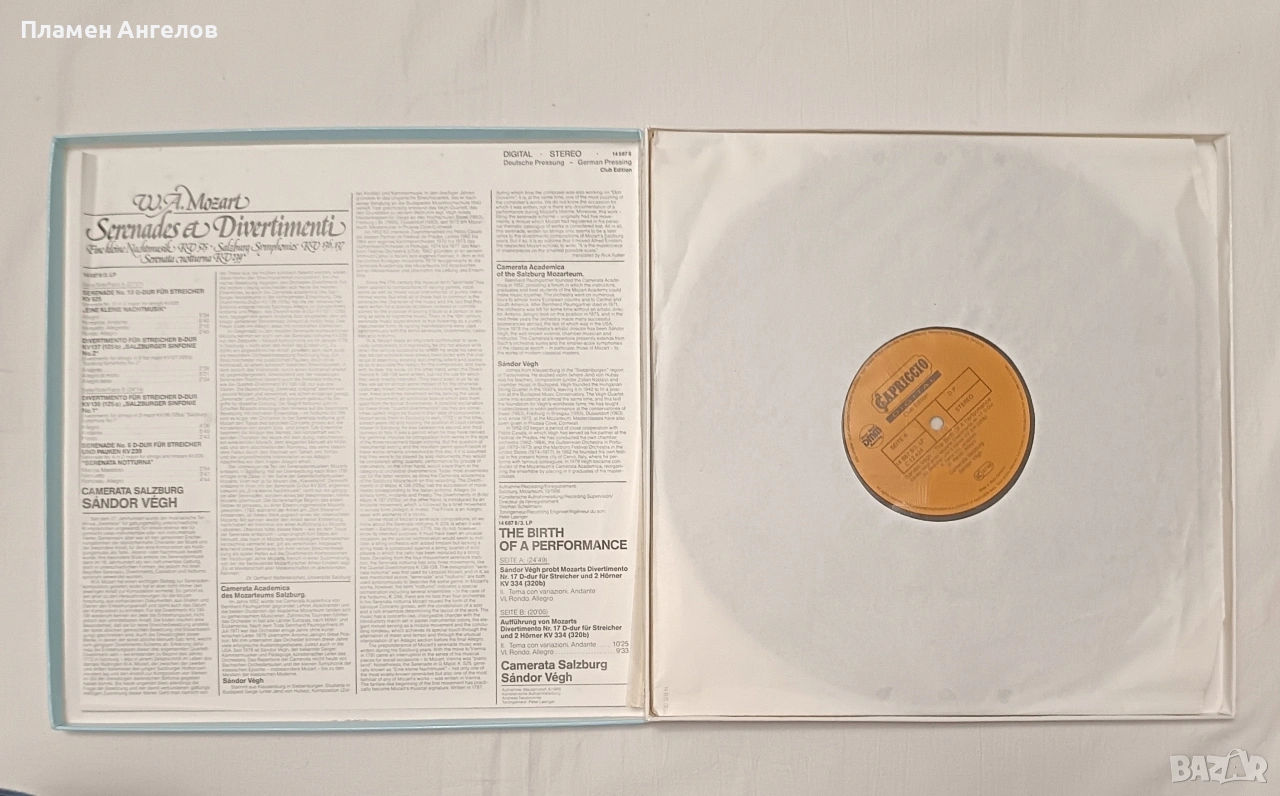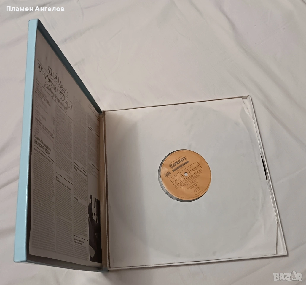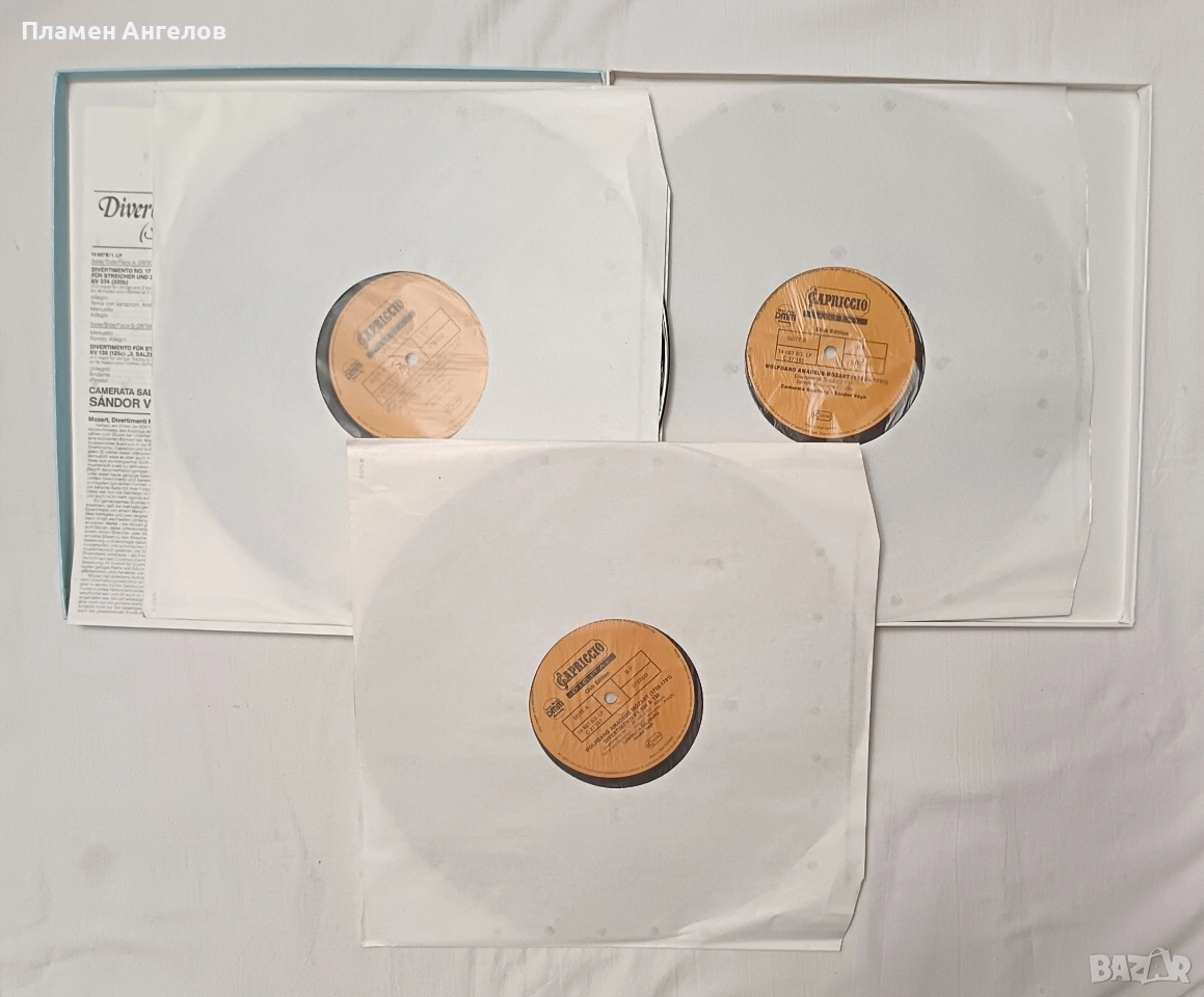 Грамофонни, винилови плочи с класическа музика на В. А. Моцарт с класическа музика. Съдържащи Симфонии, Серенади и Дивертименти от Залцбург. Издател " Capriccio" 1988г.Изпълнение на оркестър Camerata Salzburg, дирегент Жандор Веr. Използвана е технология DMM(Direct Metal Mastering) за подобряване високите чистоти и намаляване на шума за по-качествен звук. Плочите са нови не употребявани, в безупречно състояние. Без всякакви драскотинки. Кутия с 3 броя плочи в отлично състояние.
