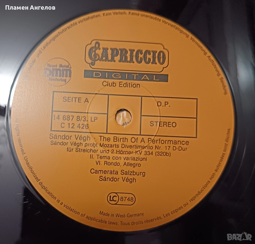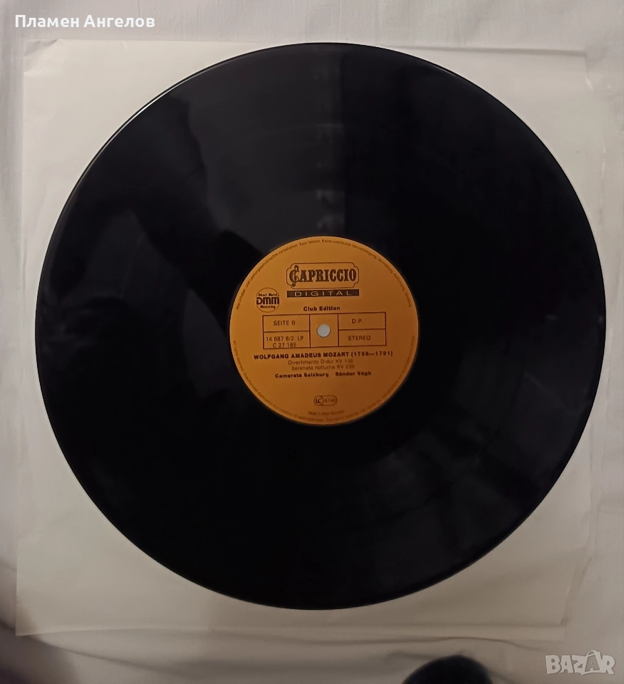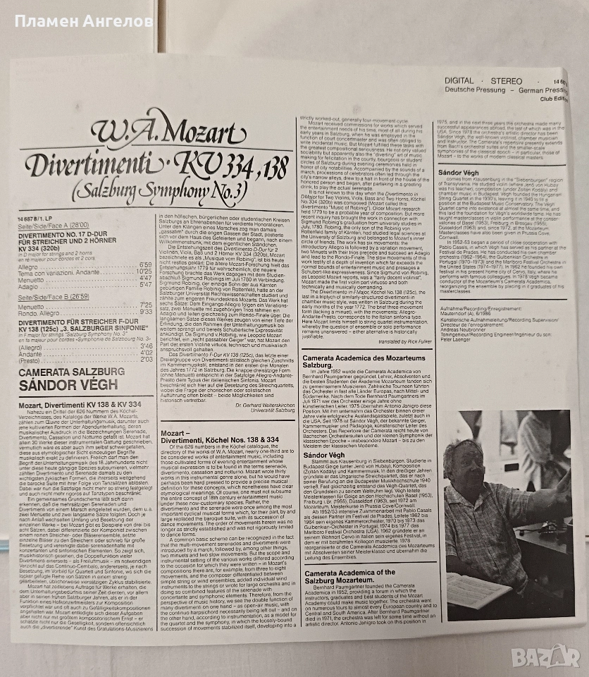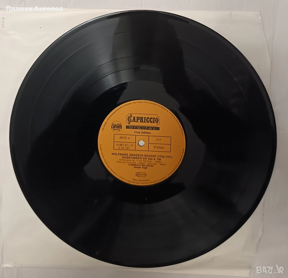 Грамофонни, винилови плочи с класическа музика на В. А. Моцарт с класическа музика. Съдържащи Симфонии, Серенади и Дивертименти от Залцбург. Издател " Capriccio" 1988г.Изпълнение на оркестър Camerata Salzburg, дирегент Жандор Веr. Използвана е технология DMM(Direct Metal Mastering) за подобряване високите чистоти и намаляване на шума за по-качествен звук. Плочите са нови не употребявани, в безупречно състояние. Без всякакви драскотинки. Кутия с 3 броя плочи в отлично състояние.