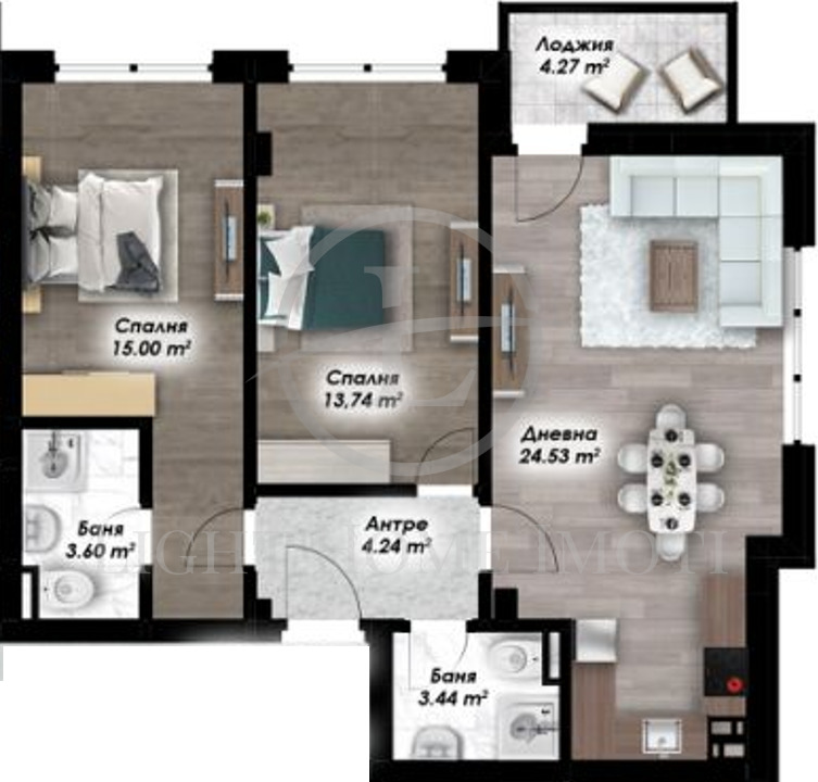 - Разпределение: Просторен хол с кухеннски бокс, две големи спални, две бани с тоалетна, антре и тераса