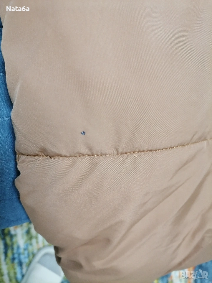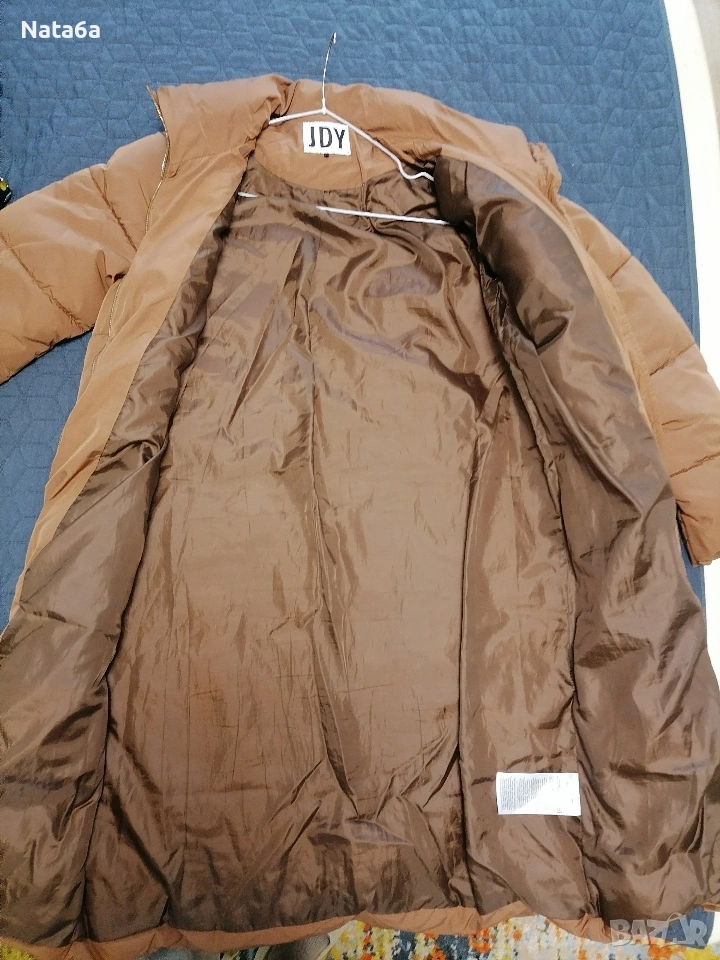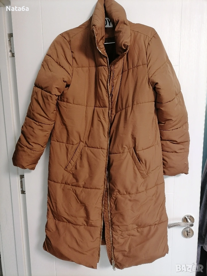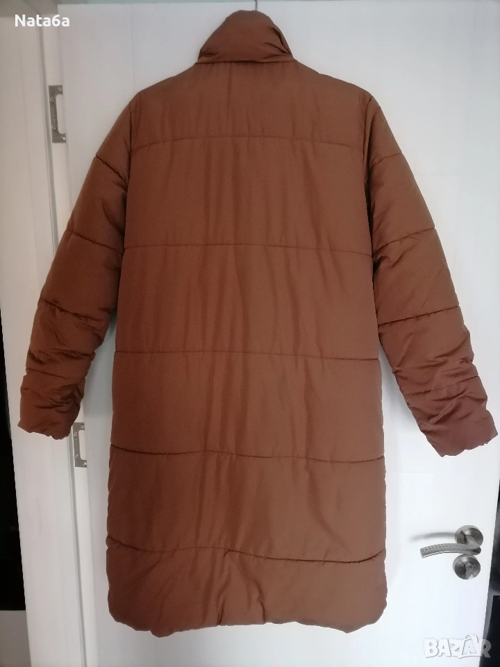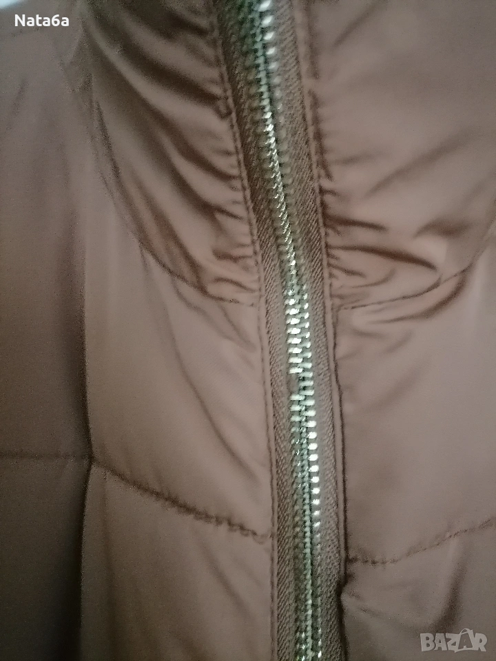 Дамско дълго яке в керемидено шоколадов цвят. Има забележки снимани са в обявата-липсват зъбчета на ципа, но се закопчава и малка дупчица отзад.