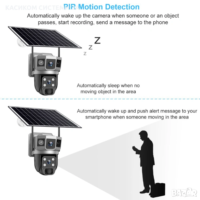 * Нощно виждане и технология за детекция на движение — система за охрана през цялото денонощие.