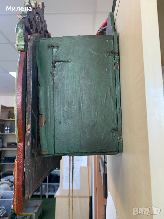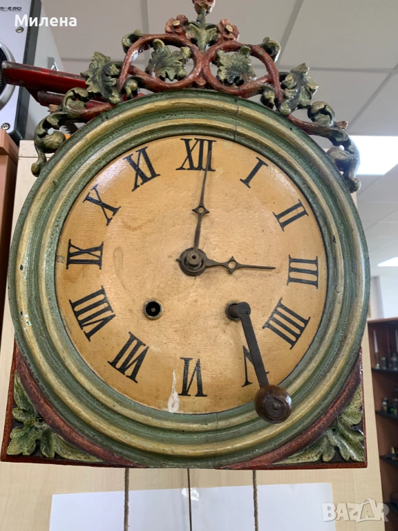 Часовника е с дървена резбована рамка боядисана в червено и зелено.