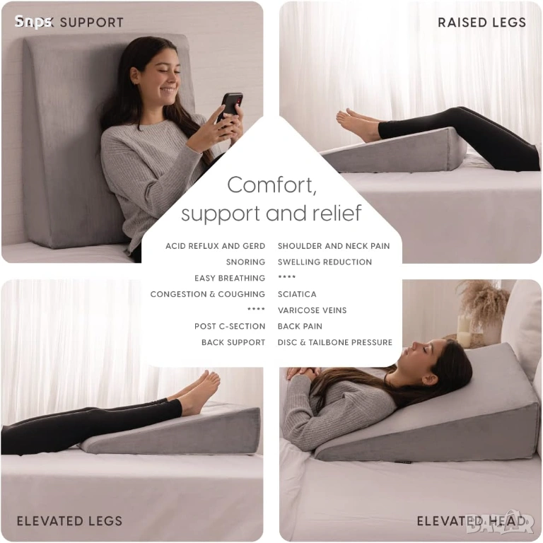 МНОГОФУНКЦИОНАЛНА Тази ергономично оформена възглавница подобрява стойката ви по време на сън, което може да предотврати ортопедични проблеми с гръбначния стълб, врата и раменете. Позиционирайте клина изправен, когато гледате телевизия или четете в леглото, или го поставете в долния край на леглото, за да повдигнете краката и стъпалата си.