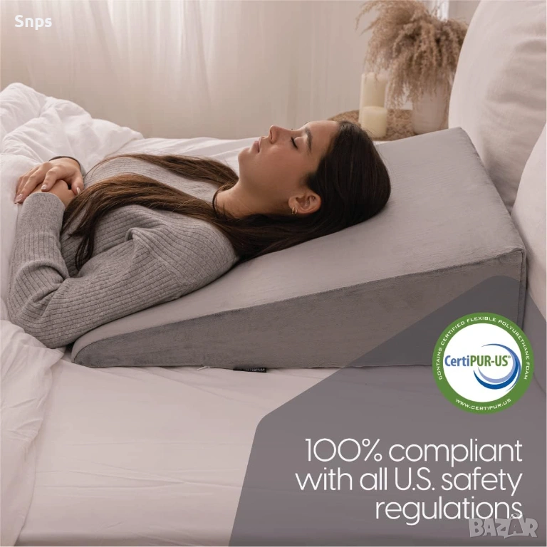 ПРЕДНАЗНАЧЕН ДА ОСИГУРИ комфорт, подкрепа и сън на страдащи от киселинен рефлукс, микроби, настинки, хрема, хъркане, кашлица и болки в гърба, като поддържа горната част на гърба и раменете.