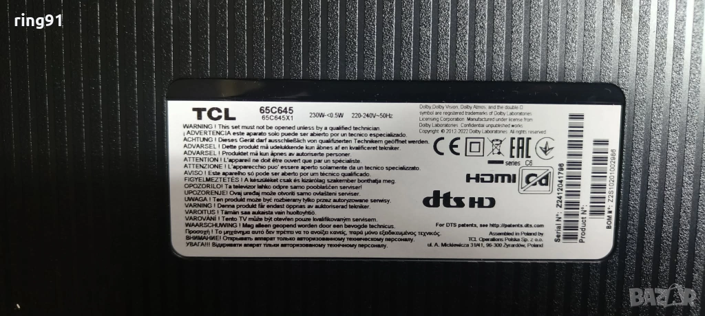 Захранване - 40-L30XW4-PWB1ZG 11601-500036 TV TCL 65C645 → Обява 53106175