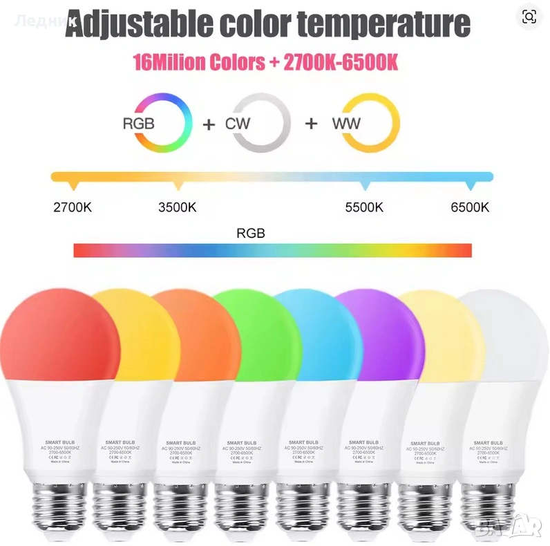 Продавам умна LED крушка E27, с пълен RGB спектър + регулируема бяла светлина (топла → студена). Подходяща за смарт дом, декоративно и основно осветление.