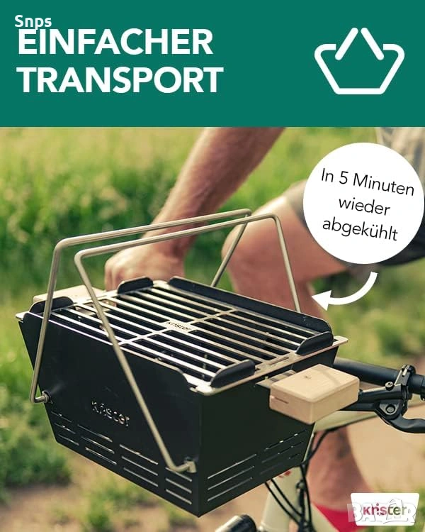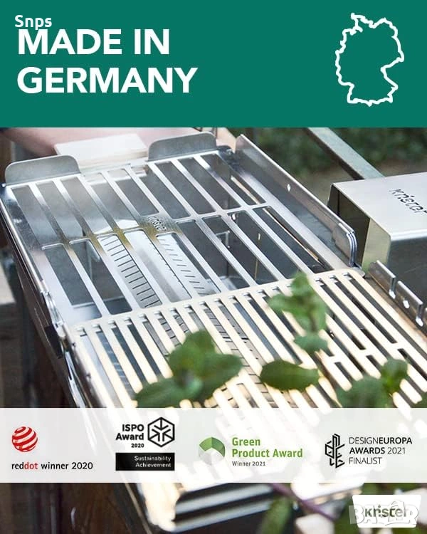 Като доставяме продукти от регионалните си производители в Германия, ние спестяваме значително количество CO2 от транспорта. Производството на скара Knister изисква 20 пъти по-малко CO2 от производството на конвенционални скари за пикник.