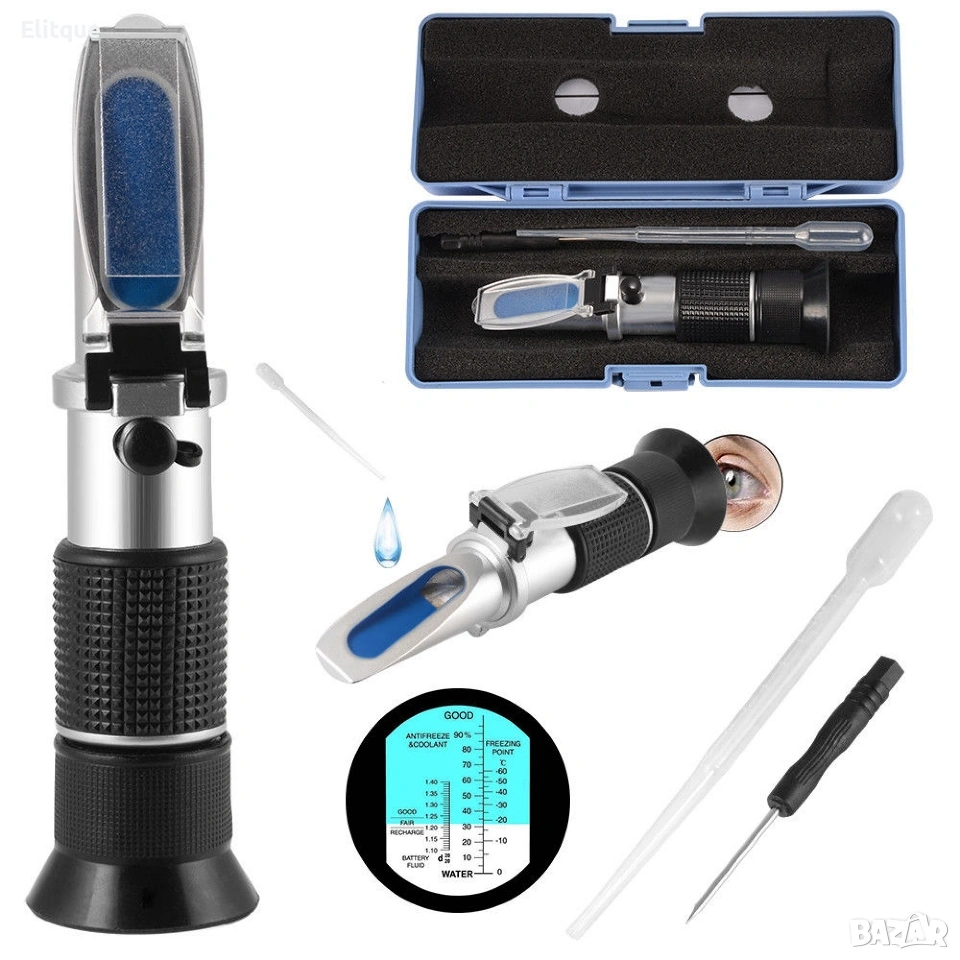 Оптичен рефрактомер за измерване на замръзване на антифриза, течноста за чистачки и състоянието на електролита на акумулатора. За измерване на антифриза са направени две скaли, според производствената характеристика - Етилен гликол или Пропилен гликол. Отделно разполага с скaла за измерване течността на чистачките и нейната температура на замръзване. Уредът е с много висока надеждност и лабораторна точност. Спецификации: Етилен гликол: -40-0 градуса; Пропилен гликол: -50-0 градуса; Акумулаторна киселина: 1.10-1.40kg/L (специфично тегло). Комплекта съдържа: 1бр. Метален рефрактометър; 1бр. Мини отвертка; 1бр. Пипета за вземане на течността; 1бр. Кутия за съхранение;