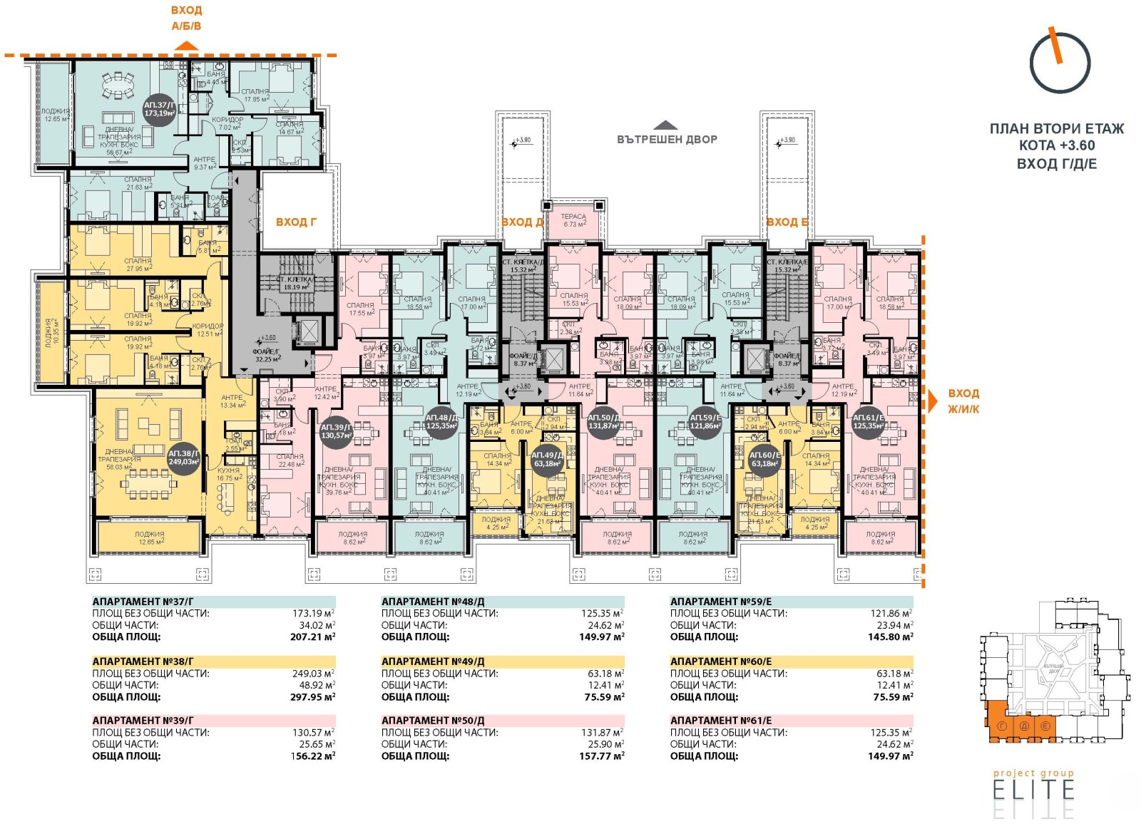 Четиристаен апартамент 38/Г, разположен на 2-ри жилищен етаж, вход Г. Изложение: юг и запад. Разпределение: антре, дневна с трапезария, отделна кухня, лоджия, коридор, три спални със самостоятелни бани, втора лоджия, тоалетна за гости, мокро помещение и склад. Застроена площ 249,03 м² + 48,77 м² общи части (16 %). Четири вида схеми на плащане с възможност за отстъпки от стойността на апартамента! 100% подсигурено банково финансиране за изграждането на проекта!