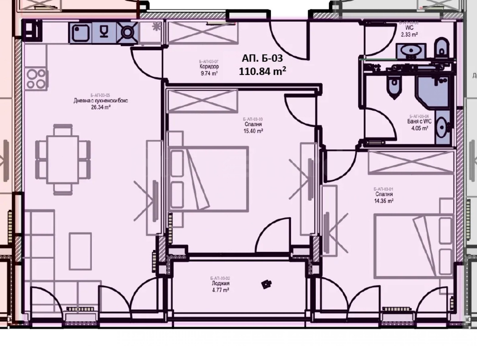 Апартаментът е разположен на 2-ри етаж и има застроена площ от 90.74 кв.м, върху която са разпределени: антре, баня/тоалетна, отделна тоалетна, дневна с кухня и трапезария, тераса, две спални. Жилището се предава в степен на завършеност по БДС, с качествена немска PVC дограма шесткамерен профил, с троен стъклопакет за висока енергийна ефективност и шумоизолация. Отоплението е с ТЕЦ, като ще са изградени медни трасета за климатици (сплит и мултисплит системи).