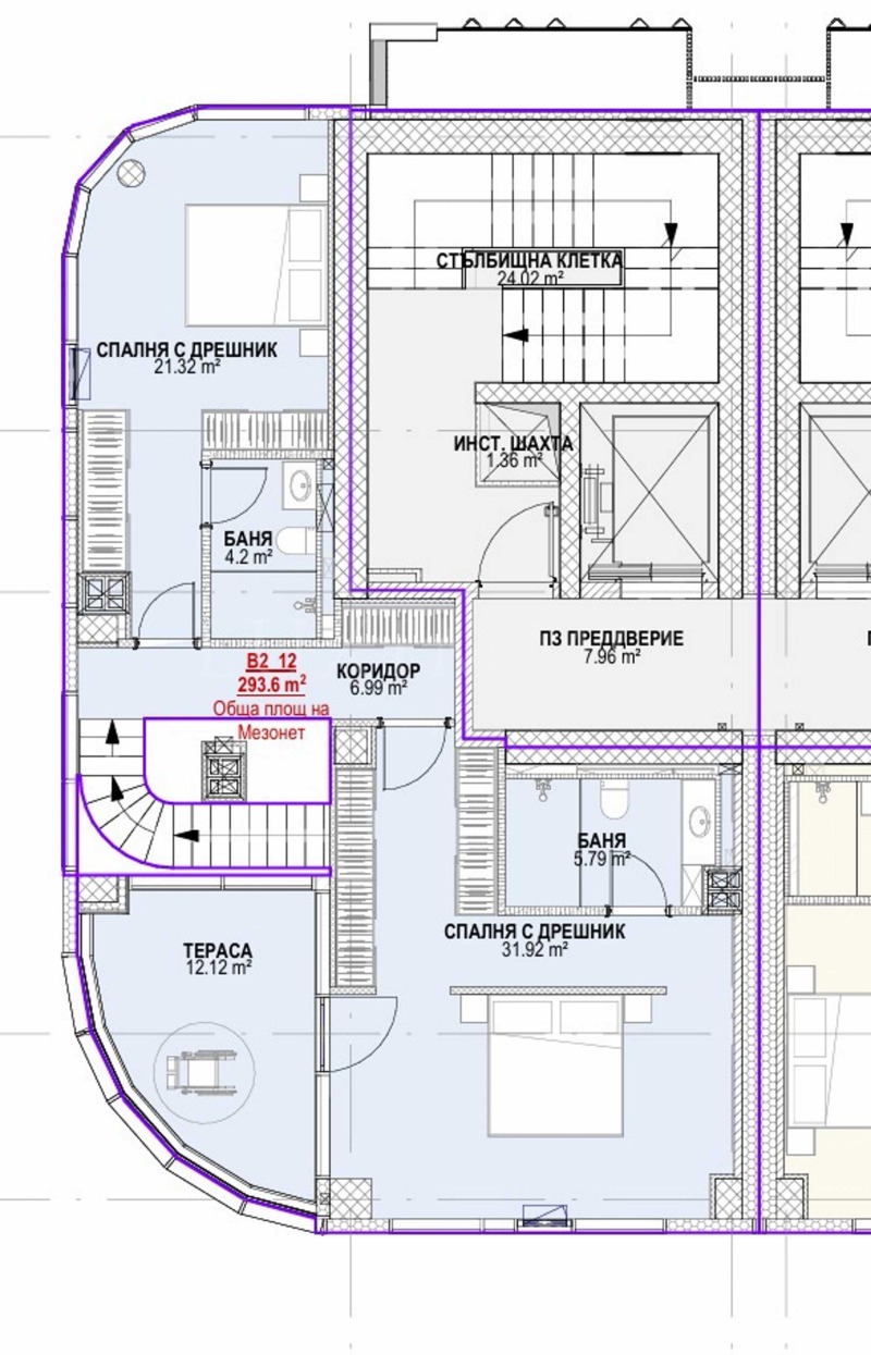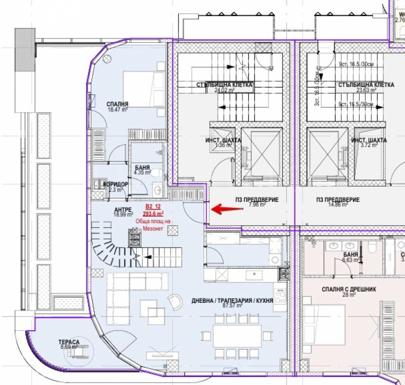 Апартаментът има обща площ 293.60 кв.м и благоприятно изложение - юг/югозапад/запад.