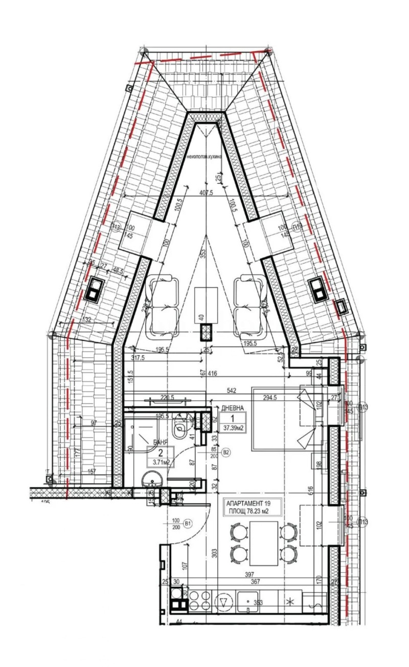 Имотът е с обща площ 91,78 кв.м, разположен е на етаж 6-ти и се състои от дневна с кухненска зона, баня/тоалетна. Към имота има мазе с площ 2.81 кв.м. Жилището се издава по БДС, с възможност новия собственик да оформи интериора по свой стил.