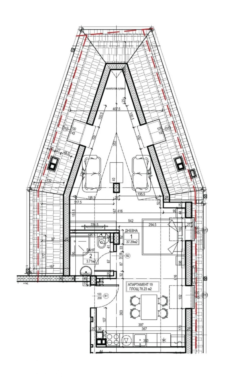 Покрив с 14 см минерална вата и двойна хидроизолация, завършен с битумни керемиди;
