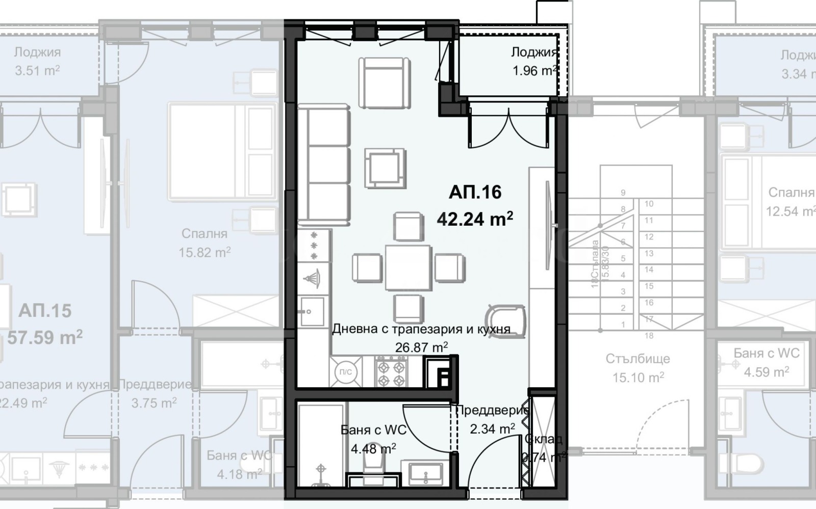 Жилището с обща площ от 59,62 кв.м е разположено на 3-ти етаж от 7.