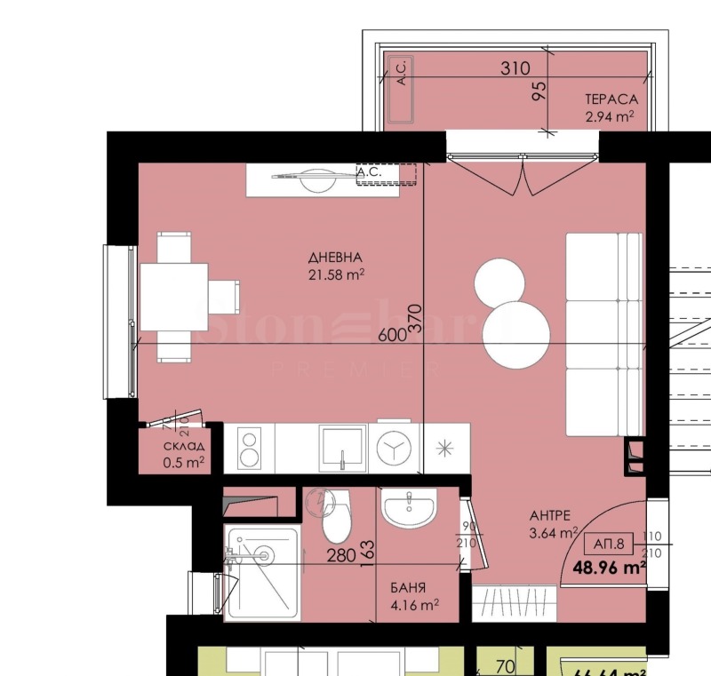 Имотът е с обща площ от 48,951 кв.м, разположен на трети етаж, със следното разпределение: антре, дневна с кухня, баня с тоалет и тераса.