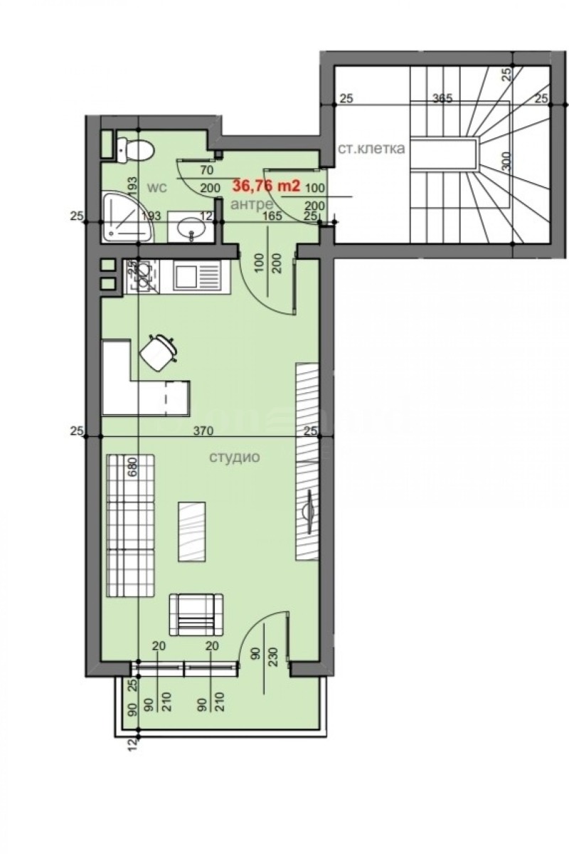 Имотът е с обща площ от 36,76 кв.м, разположен на 1-ви етаж с тераса.