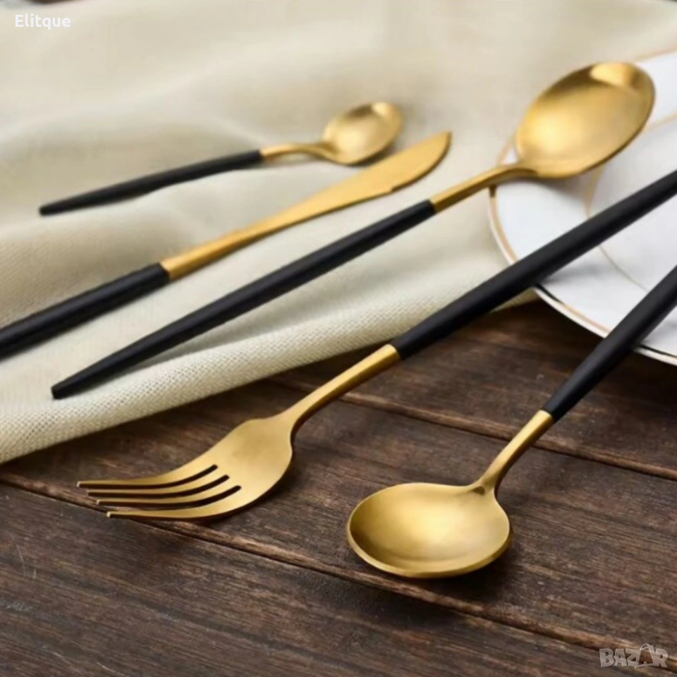 Технически характеристики: Материал: Неръждаема стомана; Брой части: 24 (за 6 души); Съдържание: 6 х н о ж о в – 22 см х 1,5 см; 6 х вилици – 22,5 см х 2,7 см; 6 х супени лъжици – 22 см х 5 см; 6 х десертни лъжички – 13 см х 3 см; Цветови варианти: Сребристо; златисто с черно; златисто с розово; златисто с червено; Поддръжка / почистване: Лесно измиване, устойчиви на честа употреба; Безопасност: Подходящи за контакт с храна; Опаковка: Магнитна кутия.