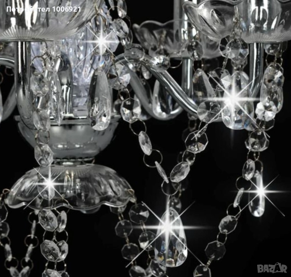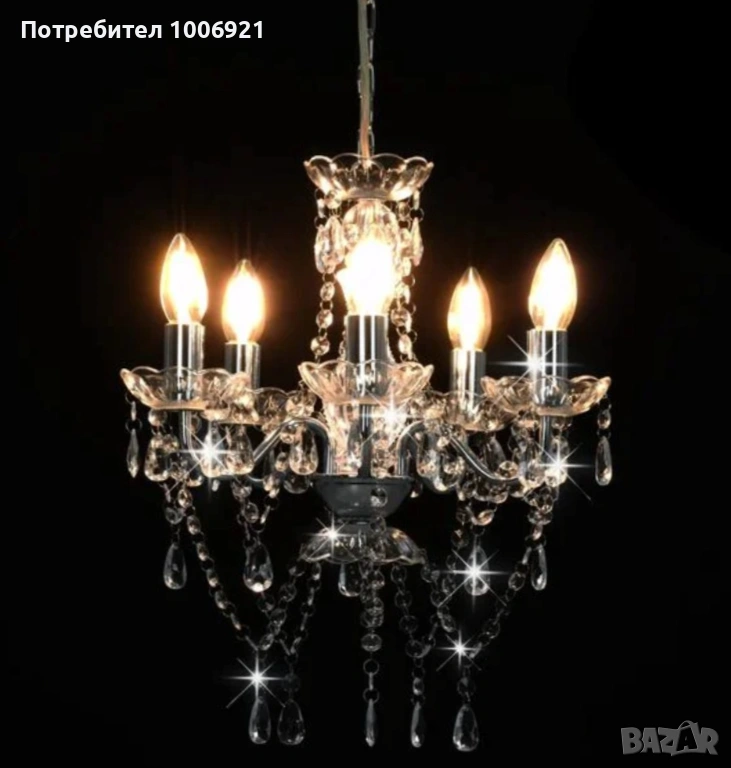 Висящ полилей от метал с акрилни висулки/ мъниста с 5 крушки E 14, Макс. 40 W 230 V, може и с LED крушки( не са включени). Наличен в розово, златисто, сребърно и черно, размери 38/40(диаметър и височина). Изпращам в цялата страна с наложен платеж.