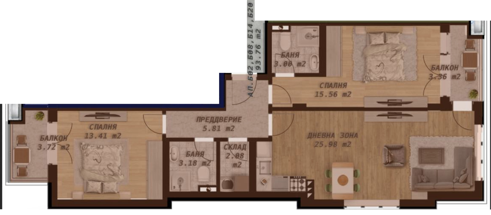 ➡ Тристаен апартамент за продажба състоящ се от преддверие, склад, 2 бани с тоалетна, 2 спални, дневна с кухня и трапезария, 2 тераси и е с обща площ от 107,34 кв.м.