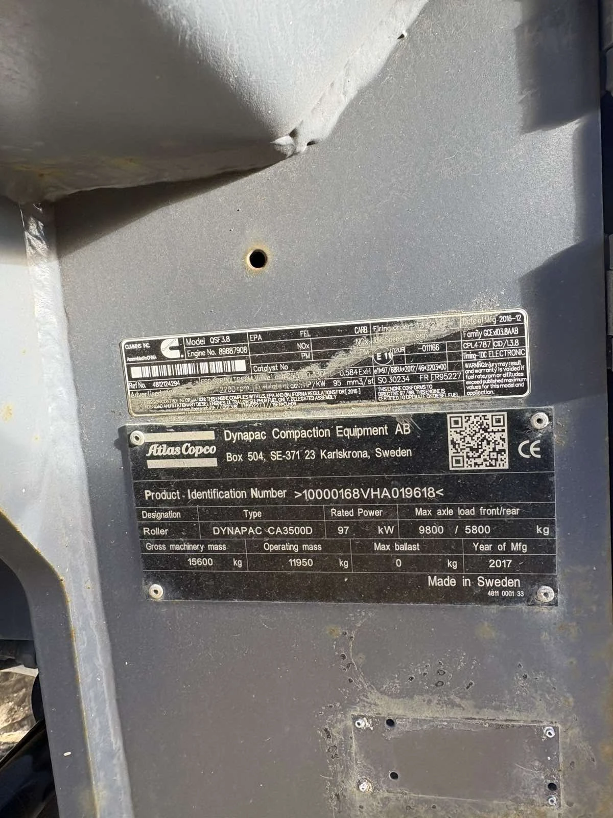 Валяк Dynapac CA3500D Нов внос. Изцяло прегледан и сервизиран. Перфектно техническо състояние! Тегло - 15600кг Работна маса - 11950кг Ширина на ролката - 2, 13м Транспортна дължина - 6м Транспортна височина - 2, 90м Транспортна ширина - 2, 30м Работни часове - 1872 Тип двигател - дизел Година на производство - 2017г Разполагаме с различни марки и модели! Предлагаме собствен лизинг и ремонтна дейност на специализирана техника!