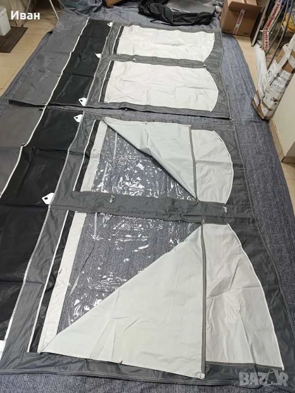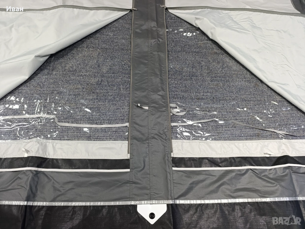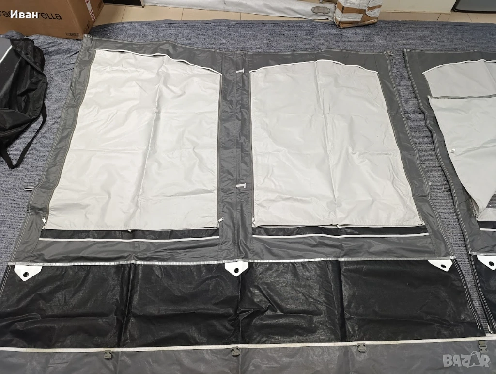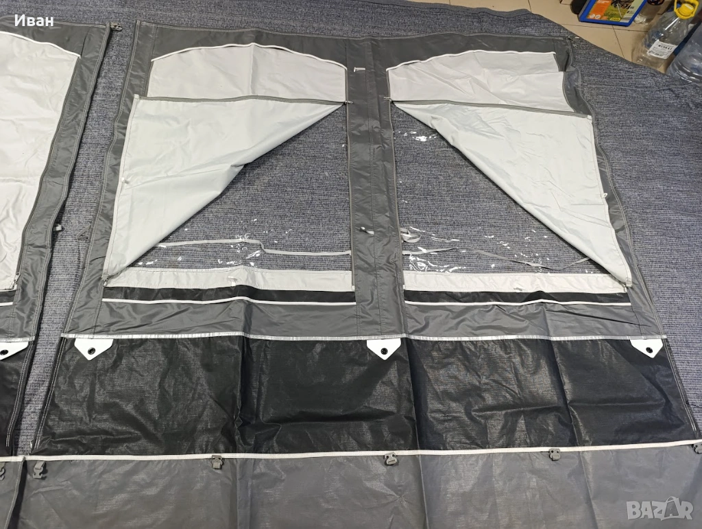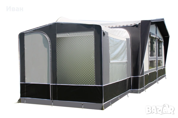 С луксозен дизайн, изключително качество и издръжливост. С материя всесезонен полиестер с покритие SR21 известна със здравина и устойчивост и не на последно място, лесна за почистване. С големи панорамни прозорци. С външни щори на всички прозорци и вътрешни завеси. Двата странични прозореца са снабдени и с комарници. С двупосочни ципове позволяващи отваряне на всички страници както отгоре-надолу,така и странично.Може да се обособява врата,както отпред така и от двете страни. Двата странични панела са огледални и могат да бъдат разменени в зависимост от предпочитанието за позициите на вратите. И четирите страници могат да бъдат частично отворени образувайки веранда или премахнати напълно.С интегрирана вентилационна система.С пети(държачи) за закрпване на покривните рейки към караваната. С регулиране на заключването на ръкохватката.