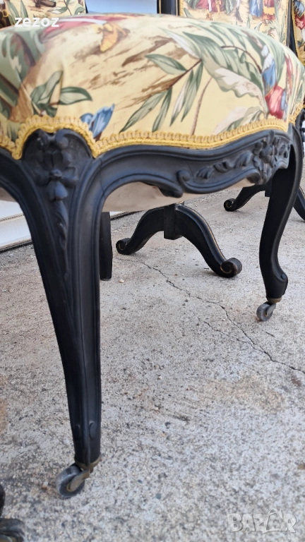 параван за камина.Конструкция масив,почернена.Интересна концепция за избор на дамаска,която най-вероятно не е оригиналната.Сменена е някога в по-ново време.Запазена е оригиналната система на седалката-пружини и ремъци.Оригиналните месингови държачи с бакелитени колелца на предните крака.Размери-