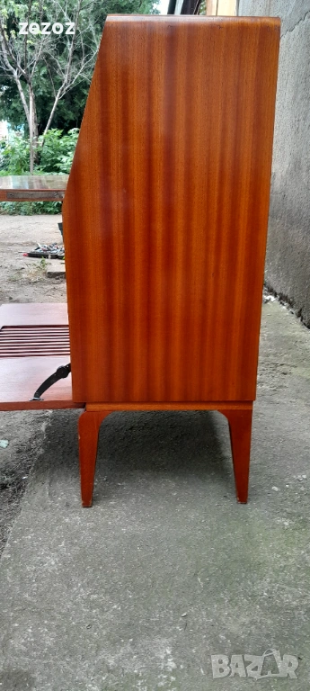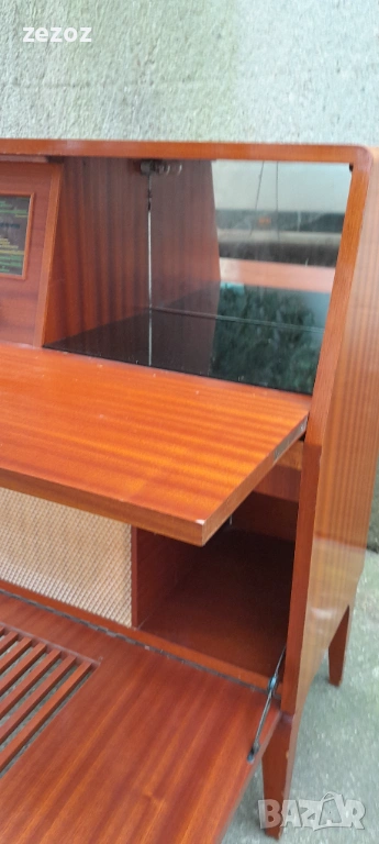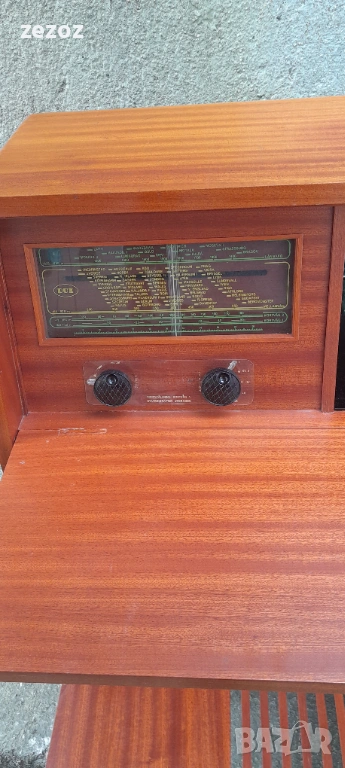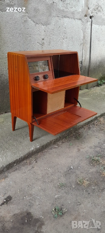 Винтидж бар с радио-DUX-шведски производител купен през1934г.от PHILIPS.Радиото свети и понеже е от преди-1952г. няма FM и не може да се ползва.Само за декорация.На мястото на грамофона е оформен бар със стъкло и огледало и от радиото се осветява.Забележки от годините-напукан лак по плота и др.-снимано.Размери-