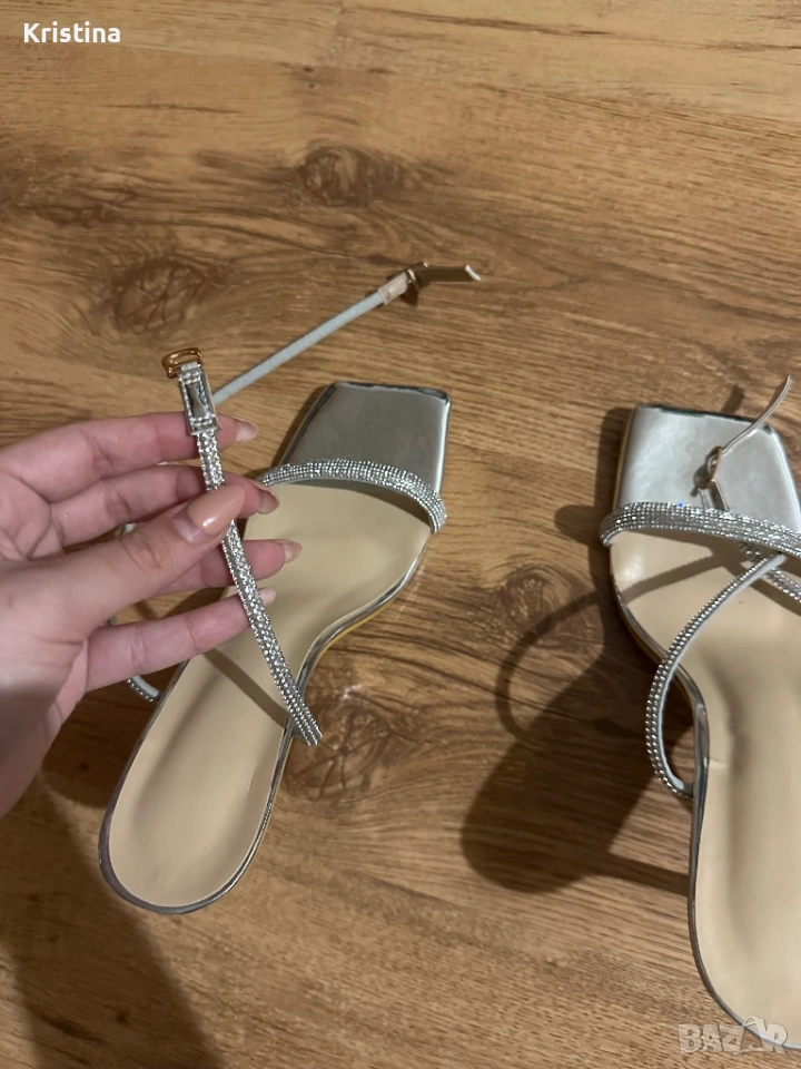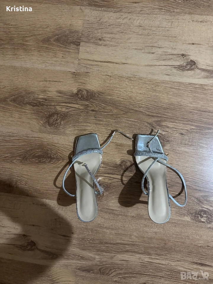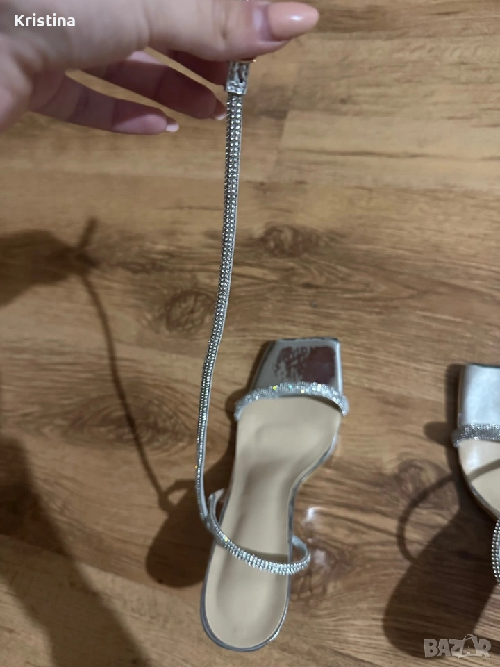 Сребърни отворени токчета тип “сандали”. Със сребърни връзки с камъчета на горе по крака. 38 номер. 9 сантиметра тънък ток.