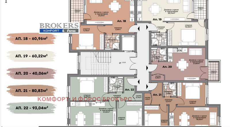 Разнообразни типове апартаменти: едностайни, двустайни и тристайни. Отлично разпределени жилища, с хубави квадратури на помещенията и павилни форми.