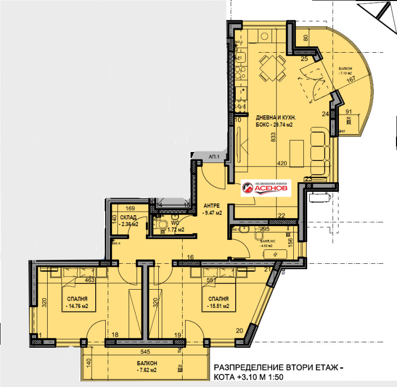 Тристаен апартамент на втори етаж със застроена площ от 113 кв.м. и 133 кв.м. с общите части в малка бутикова сграда само с 9 (девет) апартамента. Разпределение антре, дневна с кухня (30 кв.м.) и тераса, спалня 1 (15,51кв.м.) и спалня 2 (14,76кв.м.) с втора обща тераса за двете спални, баня с тоалетна, втора тоалетна и склад. Изложение север, изток и юг!