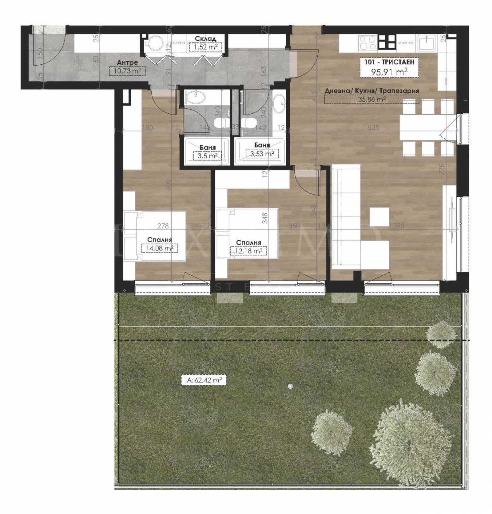 Имотът е с чиста площ от 95.91 кв.м и е разположен на партерен етаж с южно изложение и гледка към вътрешния двор.