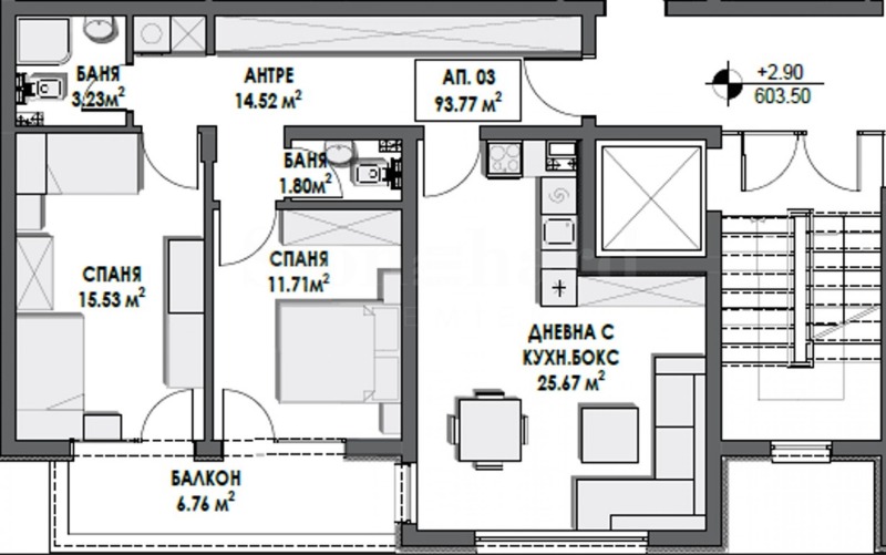 Площ: 111.50 кв.м (93.77 кв.м чиста площ + 17.73 кв.м общи части);