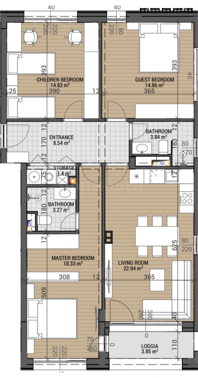 Къщи: 80 на брой, с площи от 250 до 350 кв.м, всяка със собствен двор и веранда;