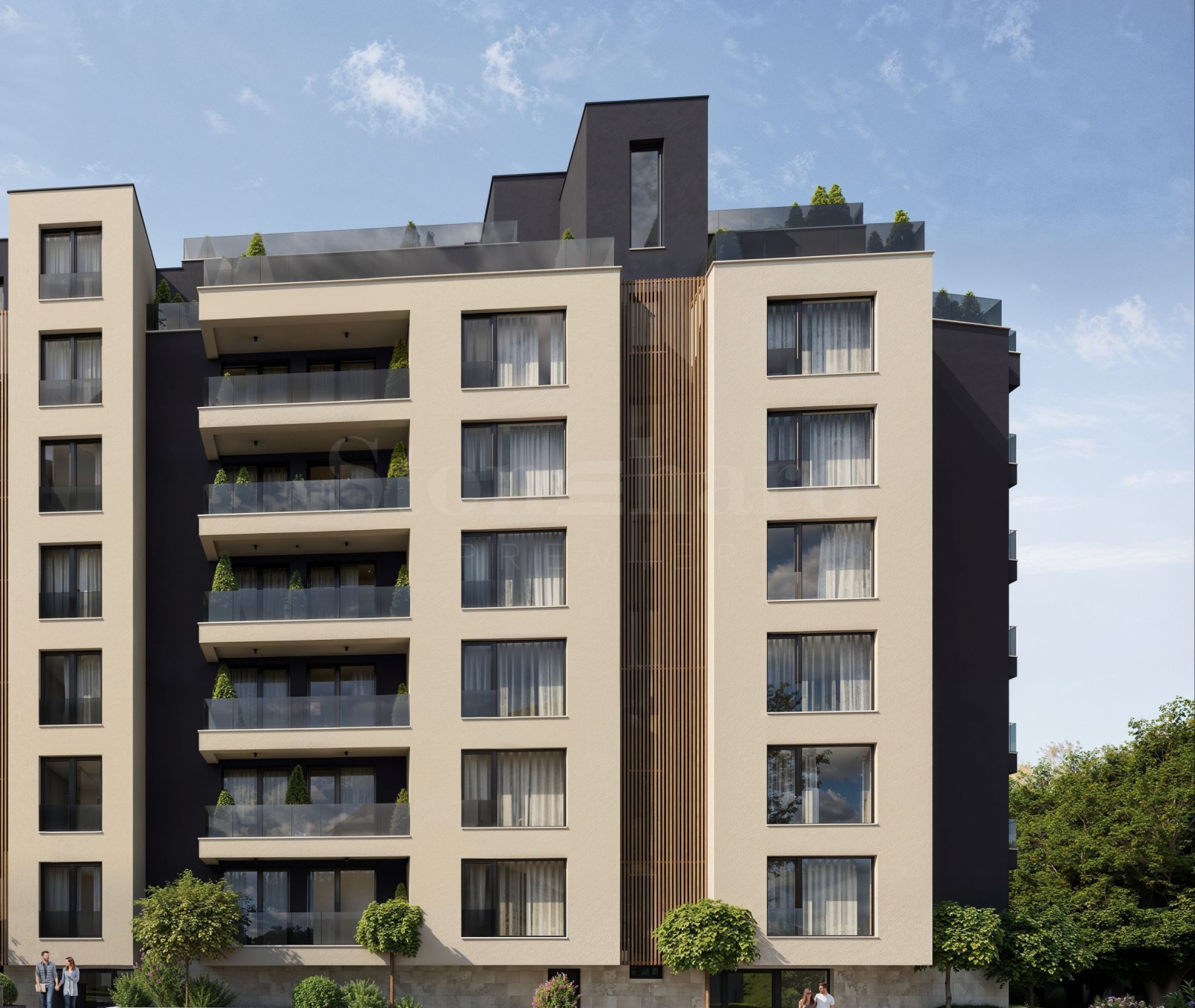 В сградата има избор от едностайни, двустайни и тристайни апартаменти за продажба с функционални разпределения и благоприятни изложения. Паркирането е решено с подземни гаражи.
