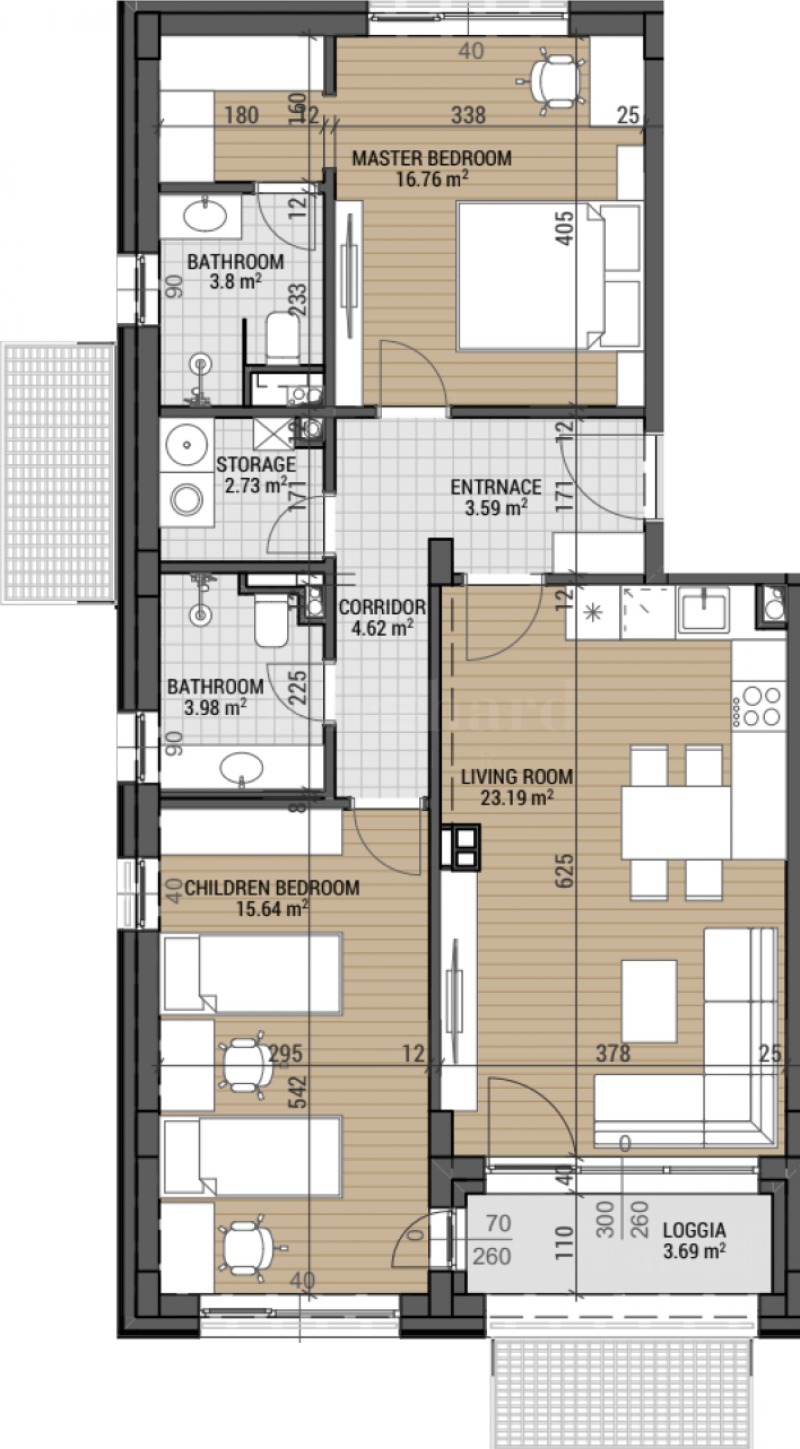 Тристайният апартамент е с площ от 124.98 кв.м, от които чиста площ е 97.58 кв.м.