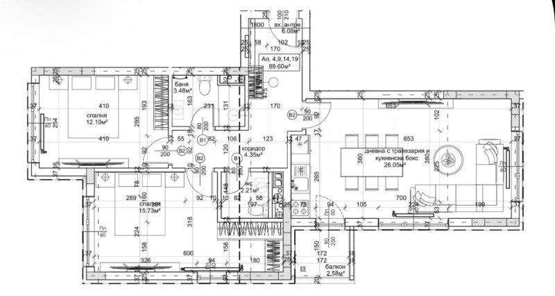 Апартаментът е разположен на 2-ри етаж и е с обща площ 102 кв.м, от които 8 кв.м са общи части.