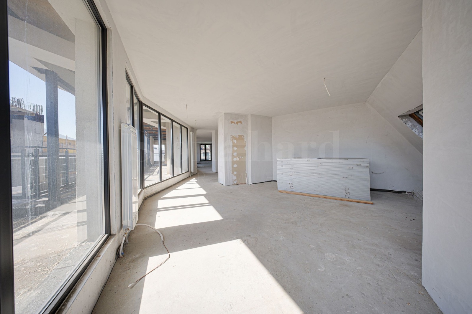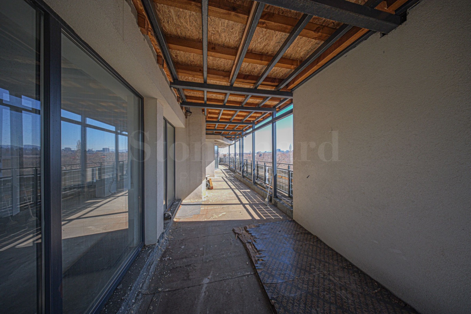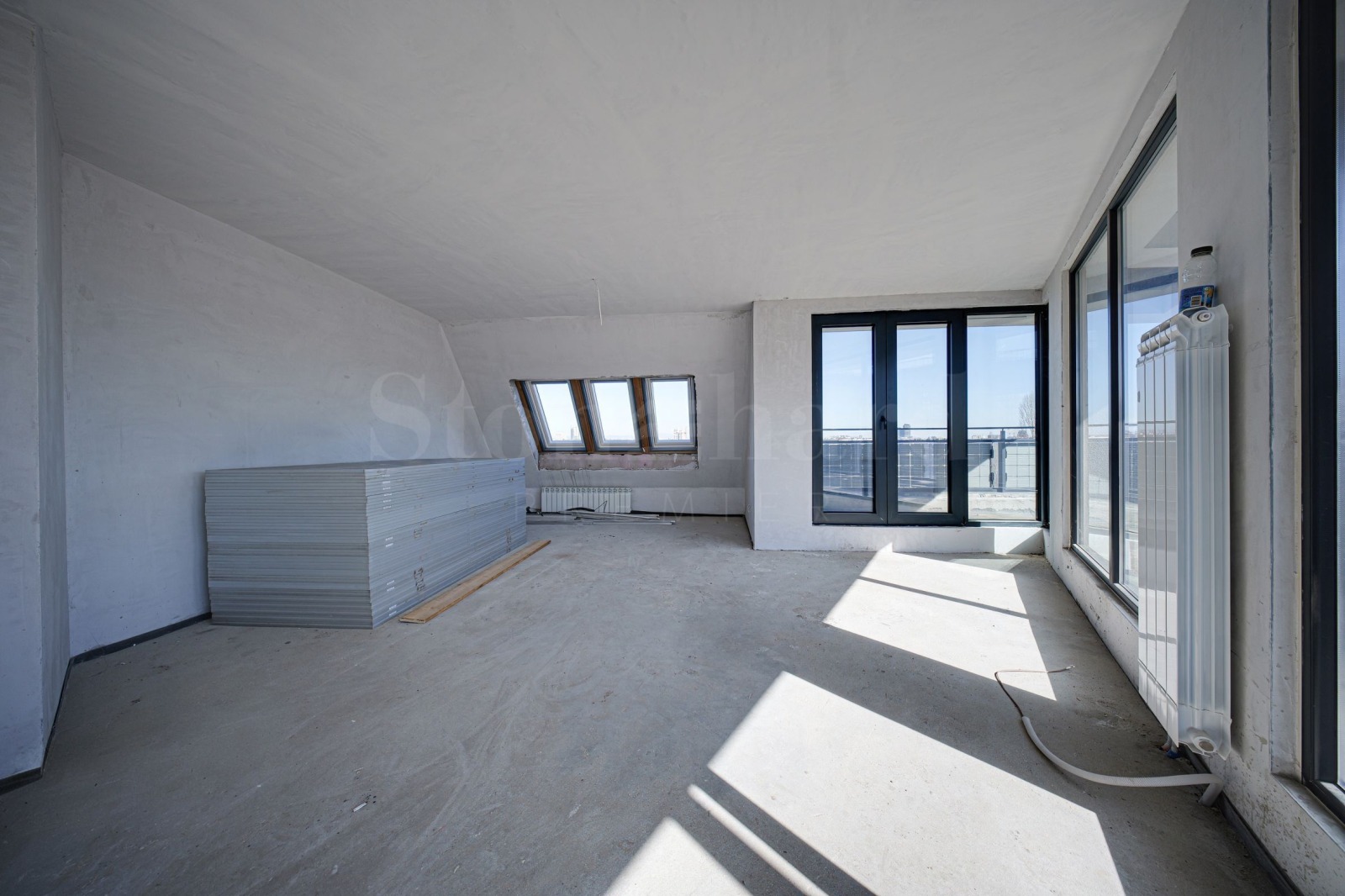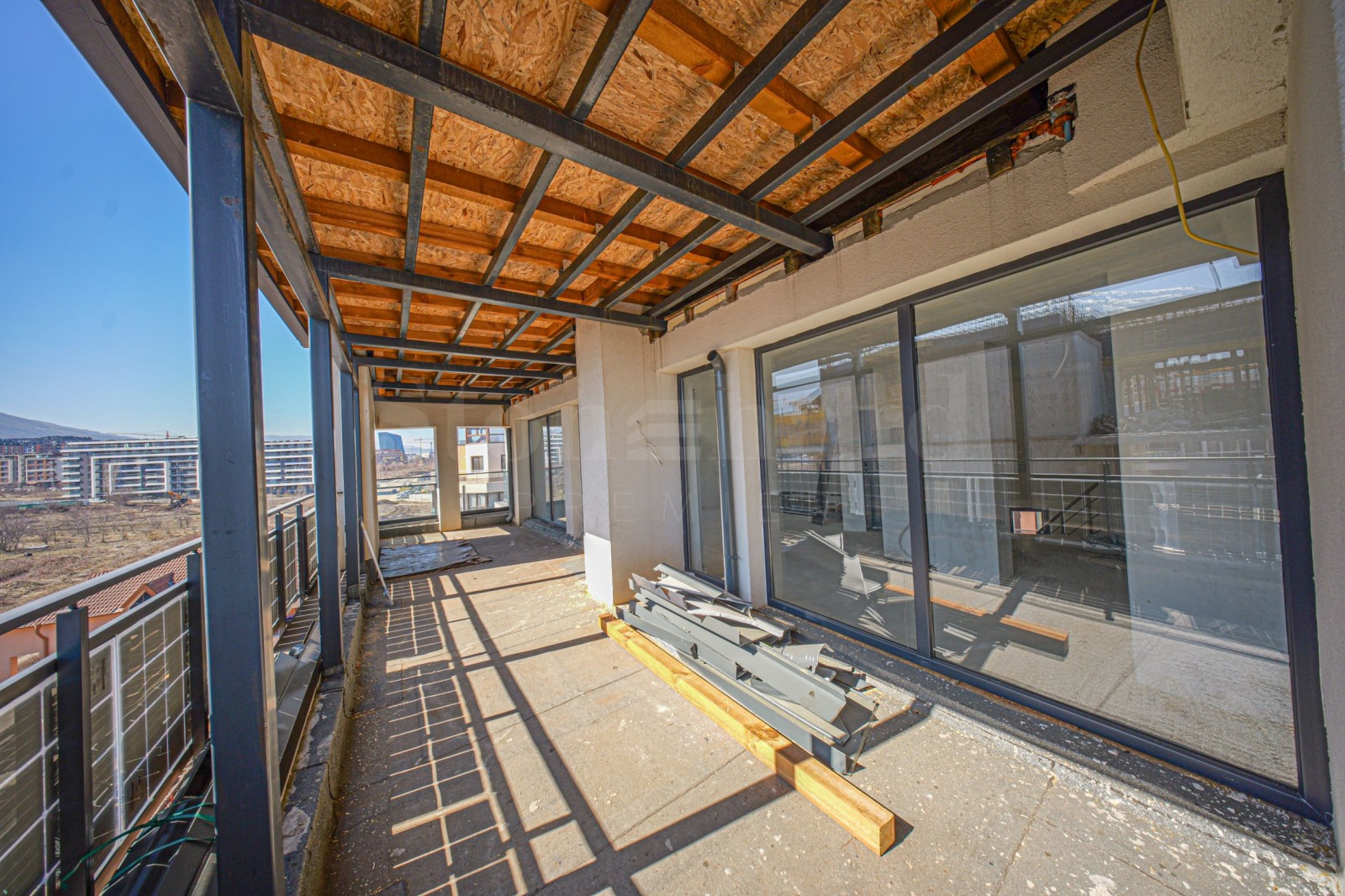 Апартаментът е разположен на цял един етаж и е с площ от 153,49кв.м, състои се от антре, хол с кухненски бокс, спалня, втора спалня, баня с тоалетна, тоалетна и панорамни тераси от всички страни.