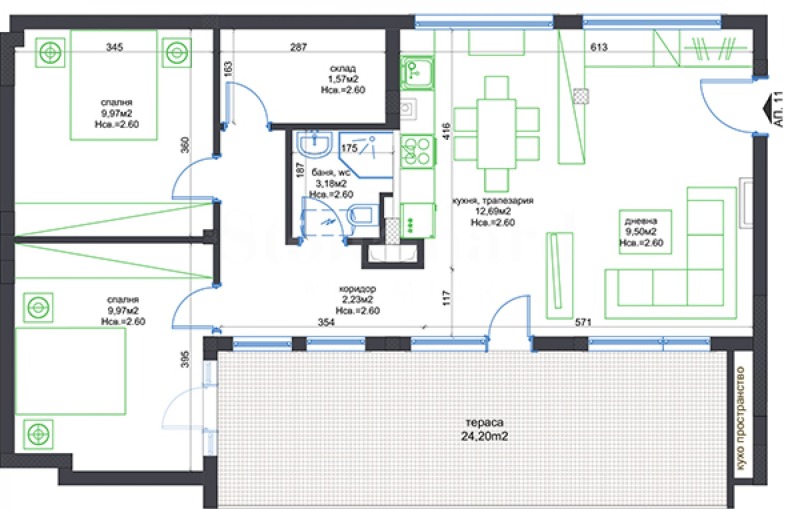 всекидневна с кухня;